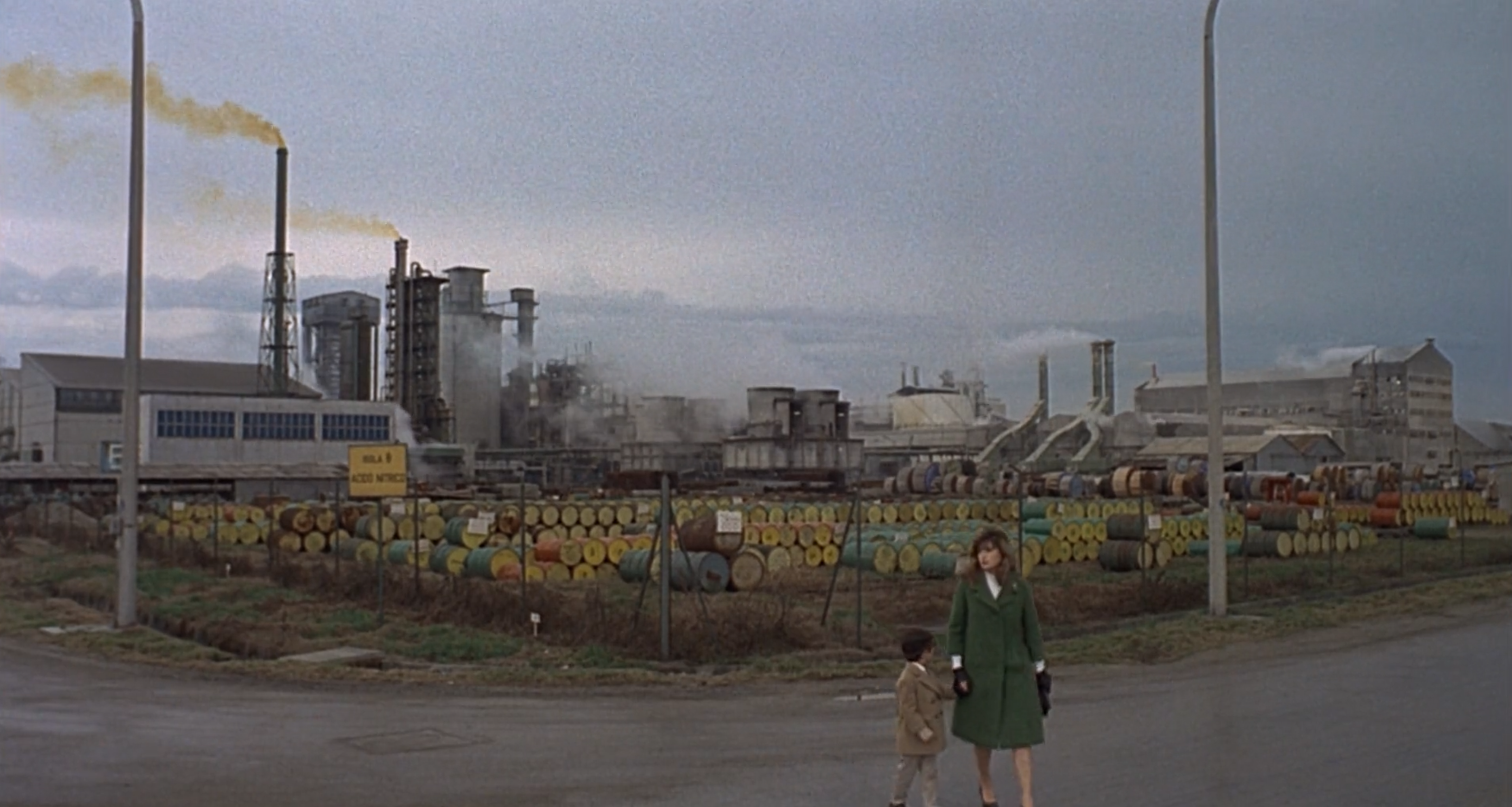 Ancor più dei soggetti, è la dimensione oggettuale, legata alle ambientazioni che incorniciano le interazioni dei personaggi, a ricoprire il ruolo di protagonista della scena. A partire dalla prima inquadratura, un fermo immagine della punta di un impianto petrolchimico che sputa fumo e fiamme nel cielo grigio, il regista schiaccia la figura umana in una giungla di tubi d’acciaio e cumuli di fuliggine, ottenendo un effetto che enfatizza la sproporzione fra l’imponenza delle fabbriche, delle macchine e di tutto ciò che fa parte degli impianti industriali, e le figure minuscole e inermi dei personaggi, che vagano senza meta nell’orbita degli edifici. Quando non vengono ritratti al cospetto di strutture gigantesche, invece, i protagonisti sono rannicchiati in piccoli spazi chiusi, in modo tale da mantenere una posizione subalterna rispetto allo sfondo, agli elementi artificiali. Le ambientazioni di Deserto Rosso sono tutte riconducibili al concetto di non-luogo elaborato dall’antropologo francese Marc Augé: degli spazi asettici e senza vita, che disattendono la ricerca identitaria, relazionale e sociale dell’individuo perché privi di radici, di storicità o di tracce di una cultura collettiva che permetta loro di riconoscersi. Per questo, il rapporto tra personaggi e sfondo riproduce con grande intensità la nostra condizione di società orfana di un mondo capace di farla sentire al sicuro, dunque assillata da un’insopportabile nostalgia di casa e tragicamente spaesata.