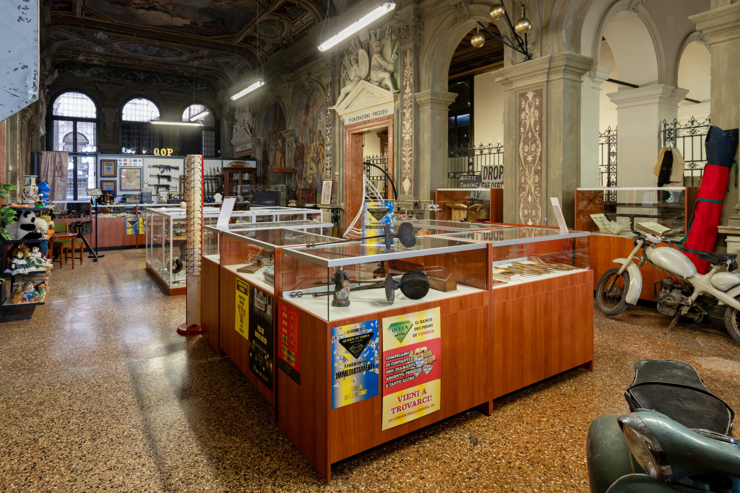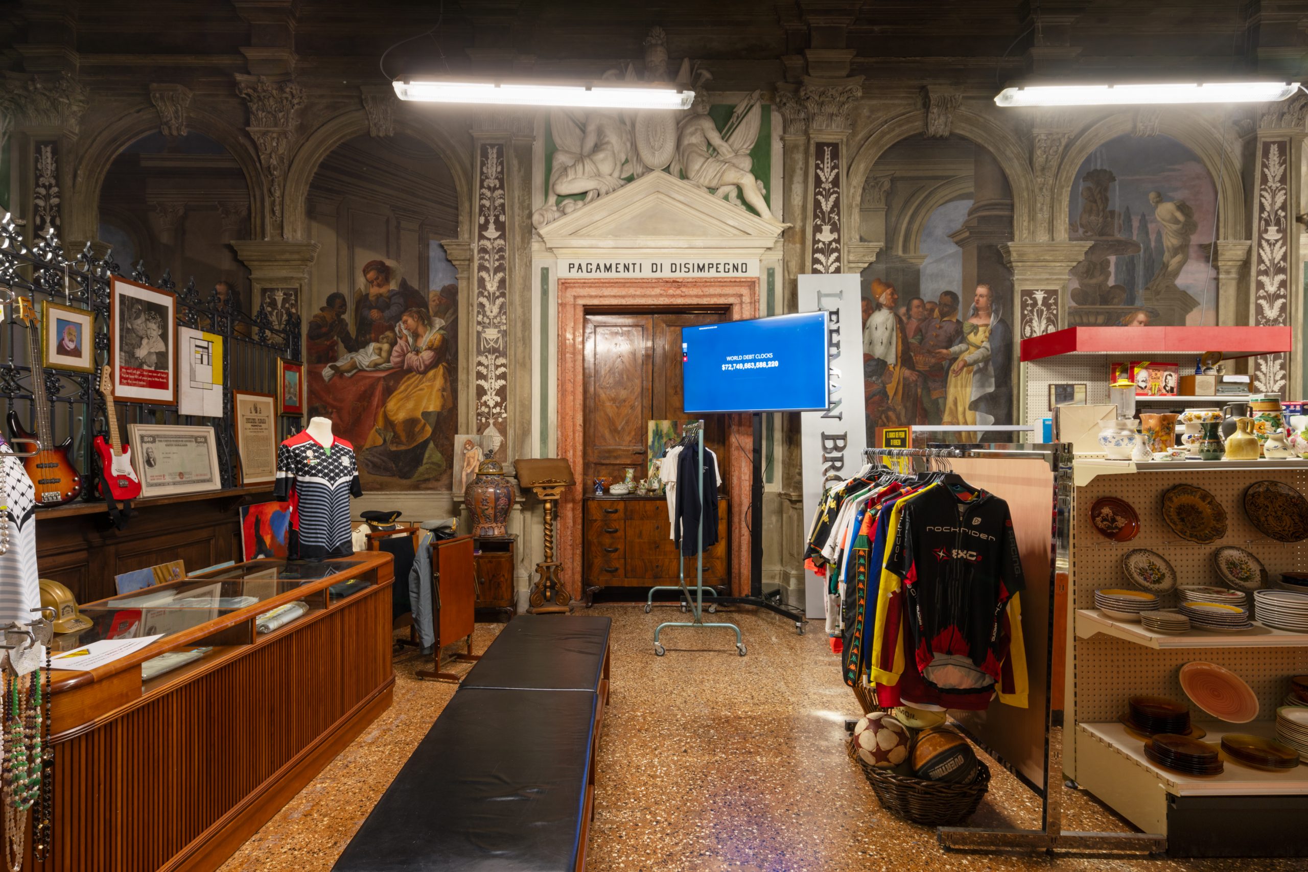 “Monte di Pietà” è indagine-voragine del concetto di debito come radice della civiltà umana e come veicolo primario con cui è sempre stato esercitato il potere politico e culturale. Venezia appare come perfetta incarnazione di questo meccanismo, essendo uno storico crocevia di commistioni e scambi commerciali e artistici, informato a livello urbano, sociale, culturale, grossolano e sottile da queste profondissime relazioni di potere e di desiderio, soggettivo e plurale, nazionale e internazionale. Il progetto riprende l’aspetto originale del Monte di Pietà Veneziano, con un banco dei pegni in fallimento, “chiuso fino a data da destinarsi”, in cui sono accatastati oggetti su oggetti, di vario valore, compresi diamanti sintetici fatti realizzare apposta da Büchel. Fin dall’inizio infatti si pone un potentissimo tensore tra oggetto e soggetto, passato e futuro, bisogno primario e desiderio, istinto e cultura, vittima e voyeur. Il banco dei pegni appare come un Compro Oro, l’estetica pacchiana atta a carpire l’attenzione dei disperati, “un diamante è per sempre”. Ma il discrimine è che il diamante mantiene per sempre intatte le sue qualità. Gli oggetti, invece, anche se ci sopravvivono, al pari dei nostri corpi invecchiano, si guastano, imputridiscono. Intrisi della nostra storia, tuttavia, occupano uno spazio enorme, anche quando inutilizzati o inutilizzabili, metafisico e materiale, che preme ai bordi della nostra coscienza, personale e collettiva, un inconscio pronto a esondare come un conato di vomito, appena allentiamo un attimo il giogo delle nostre difese; a sommergere la piccola identità che a costo di un prezzo altissimo siamo riusciti faticosamente a scolpire, indebitandoci fino al midollo, di un debito che non potremo mai estinguere, di coerenza, d’affetto, di compassione, di pietà. Essere chi siamo – a scapito degli altri – ha un costo che non ci possiamo permettere, ecco cosa ci sbatte in faccia Büchel.