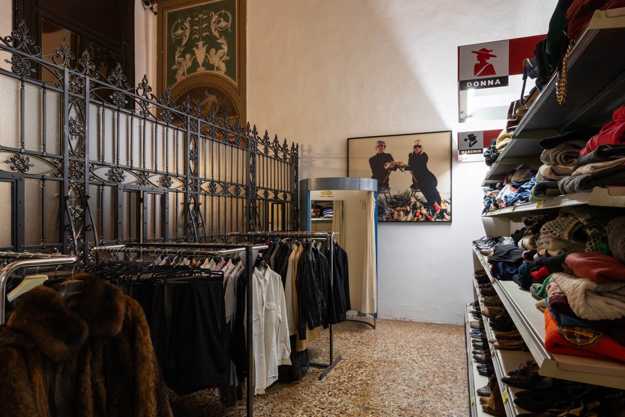 All’interno di questa enorme installazione siamo costretti ad abbandonare le nostre abitudini percettive, facendo attenzione a ogni movimento, a ogni sguardo, proprio a causa di un senso di pericolo diffuso ottenuto grazie allo straniamento, anzi, meglio, lo “spaesamento”, innescato fin dall’esterno del palazzo, quell’Unheimliche freudiano, reso in italiano col concetto di “perturbante”. “Monte di Pietà” è infatti una perturbazione esperienziale, bouleversante, sconvolgente, proprio perché ribalta la nostra percezione, i nostri pattern cognitivi ed emotivi – tra povertà, guerre, abbandono, mancanza, o dimenticanza. Attraversandola sembra di essere finiti in uno di quei sogni (incubi?) da cui non ci si riesce a svegliare, e in cui pure si è completamente padroni di sé, svegli eppure sognanti. Anche i visitatori stessi sembrano comparse scritturate solo per popolare la mostra, fasulli. Ci si sente come come se potesse succedere da un momento all’altro qualcosa di tremendo e irreversibile. Siamo disorientati davanti al varco aperto sul passato, sul ricordo, all’esperienza più disturbante. Uno stratificarsi di memorie storiche collettive, un intersecarsi ormai indistinto di culture. Nella penombra, o accecati da luci abbaglianti, tra la polvere e le muffe, Büchel ci chiede di addentrarci in uno spazio che non vogliamo esperire, e che pure vorremmo scoprire. Si attiva così una sorta di meccanismo erotico, che come tale coinvolge la nostra insopprimibile – a volte fatale – curiosità.
