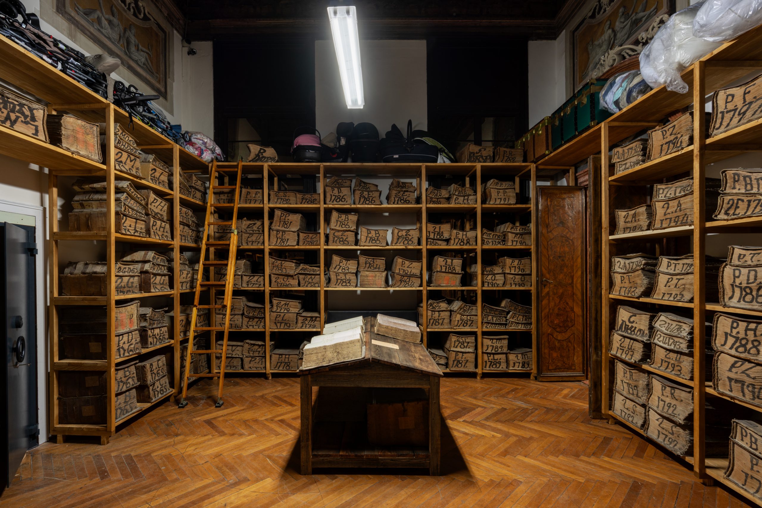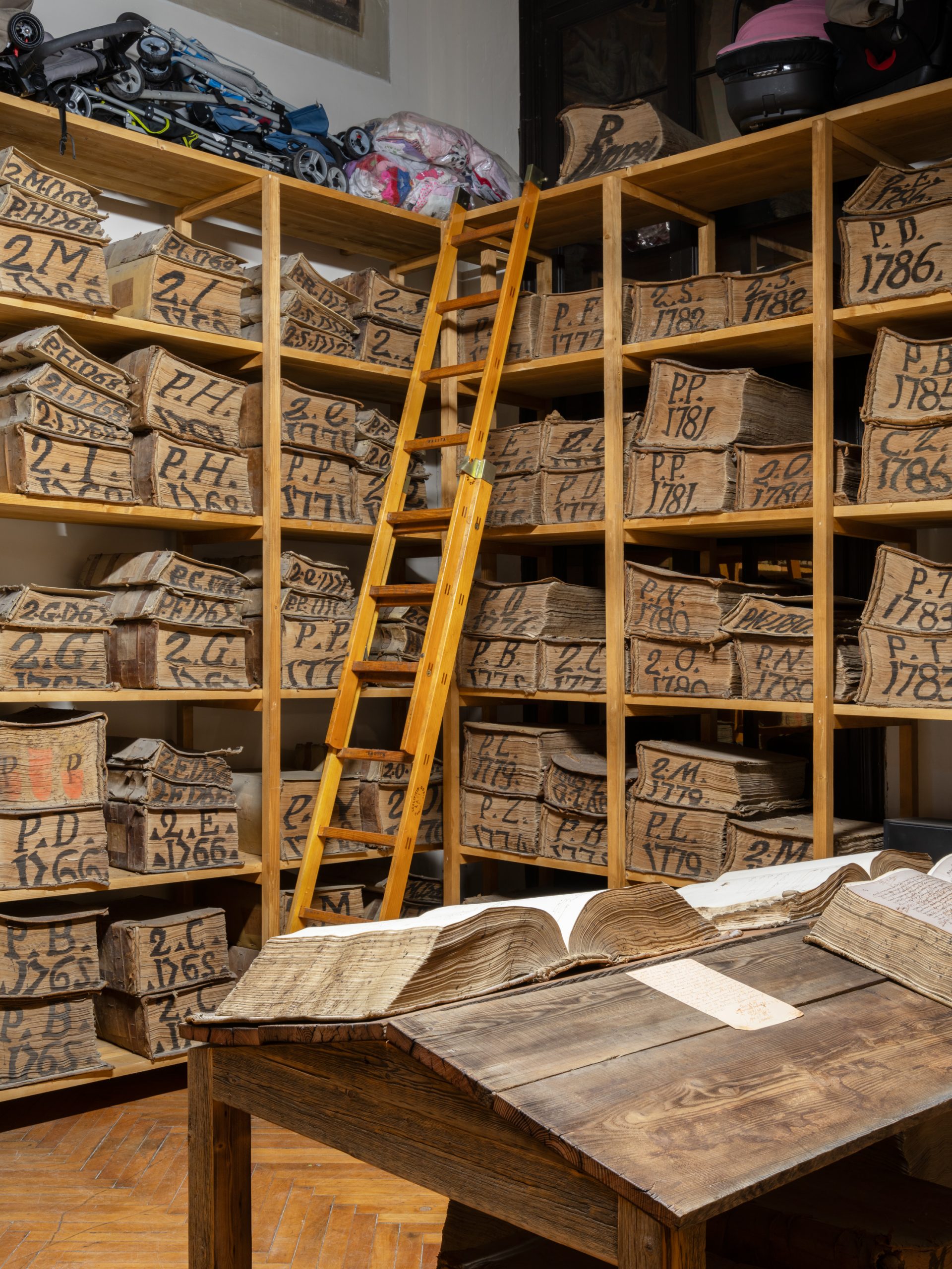 Vestiti, trucchi, libri, dipinti, quaderni di scuola, fotografie, archivi, armi, elettrodomestici, e le giostrine che c’erano negli anni 90 nelle spiagge libere, in riviera (un colpo al cuore). Gli orologi, le monete, i francobolli. I simboli del tempo, dello scambio e delle relazioni col mondo. E ovviamente le lettere. Le cartoline. I biglietti. I banconi, all’ultimo piano, giocano un ruolo fondamentale nella suddivisione dello spazio, ma anche nella gerarchia tra esseri umani. Qualcosa che ha a che fare con lo scambio, il commercio, il “negozio”, e l’attesa. Tanto che alcuni visitatori si avventurano dove non dovrebbero, e vengono duramente ripresi. Tutto ci ripete che solo i diamanti sono per sempre, tutto il resto deperisce, anche se molto lentamente. Libri di scacchi, scacchiere, strategie domestiche. Storie personali che creano una storia collettiva. Bilance, microscopi, tutto ha un valore simbolico. Giacche e scarpe usate che silenziosamente ci rimandano i mucchi raccolti dai nazisti.