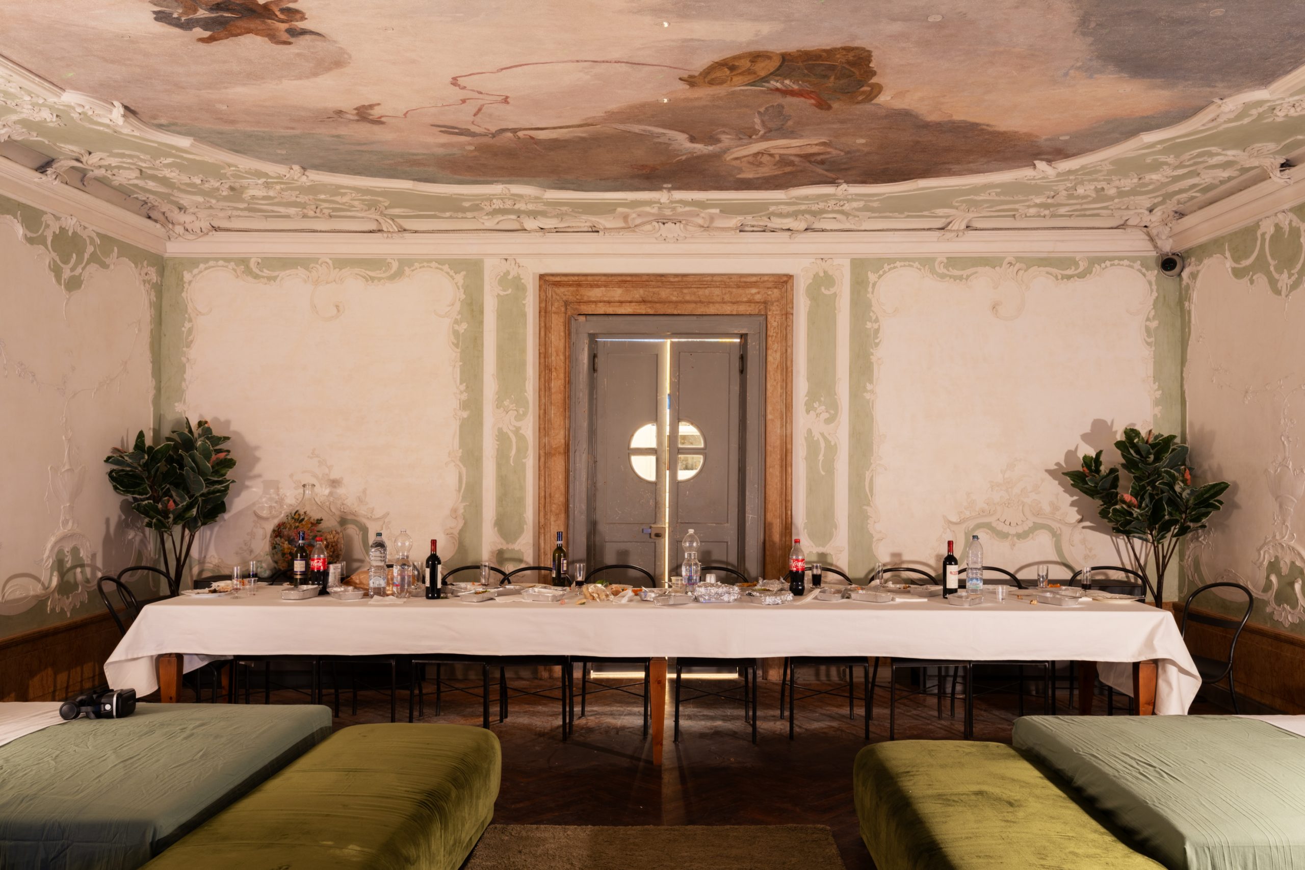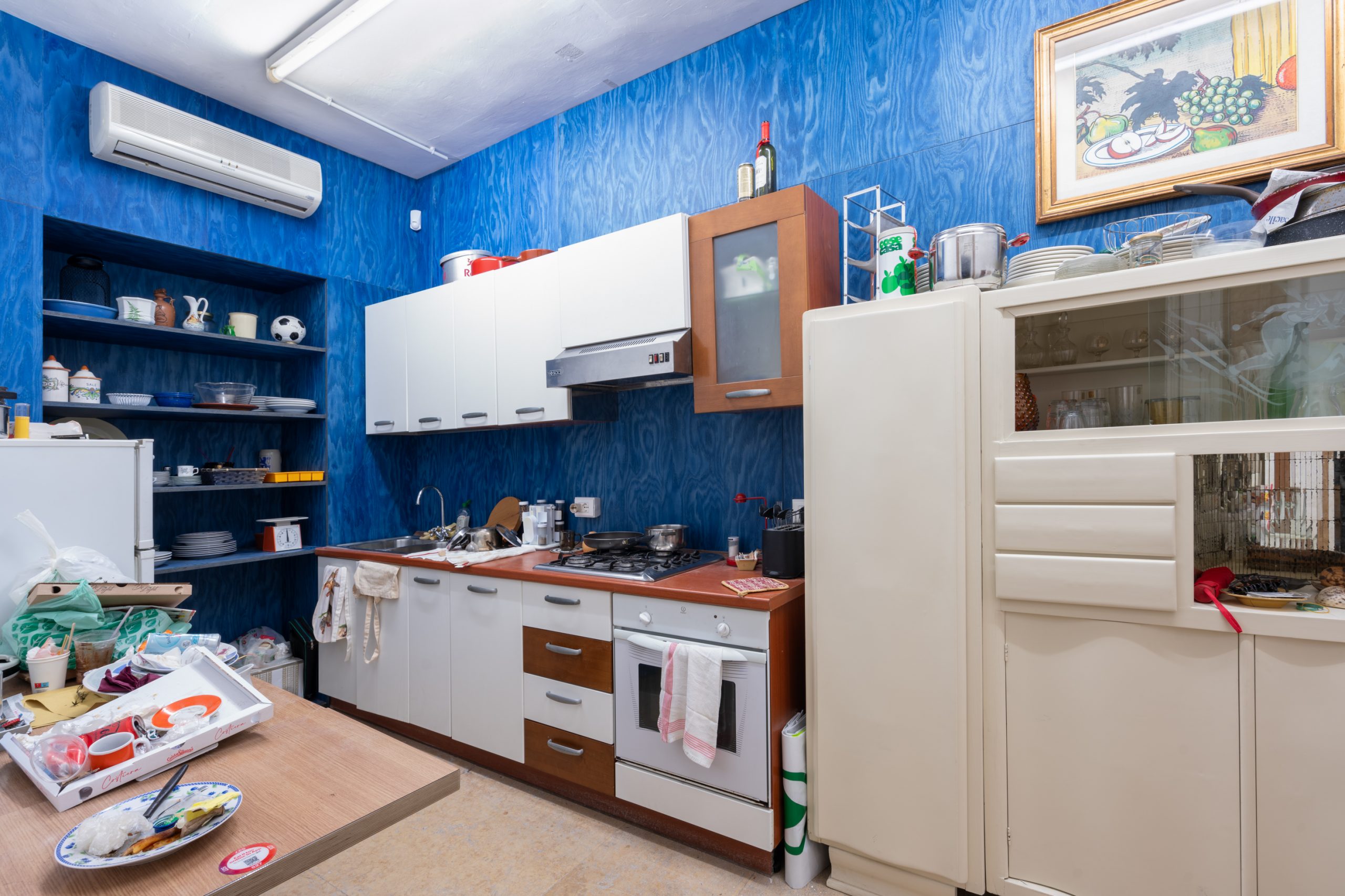 In ogni spazio tornano come oggetti totem stampelle, sedie a rotelle, protesi, a ricordare insistentemente questa condizione di fragilità, di irreparabilità, di violenza, di essere complici col male che accade nel mondo, delle guerre dettate sempre dal denaro, dal potere. Questi oggetti assumono sagome spaventose, macabre, proprio perché risvegliano la nostra paura, il nostro sentirci colpevoli. Ci fanno confrontare con la cosiddetta “disabilità”, altro termine per cui ci sentiamo colpevoli, che confessa un privilegio. Gli oggetti sono vecchi, corpi che hanno resistito al tempo come hanno potuto, e in questo estremamente simili a noi. Ciclette. Asciugamani sporchi. Vecchie lenzuola e coperte. Stufette. Mobili in formica. Gli oggetti raccolti da Büchel potrebbero essere semplici oggetti, “normali”, ma non lo sono, perché gli oggetti veicolano sempre un messaggio, una semantica, una funzione. Ci minacciano con le loro forme, le loro ombre, ci parlano. Iconici mobili Ikea, come il tavolino Lack, o il mobile composto da cubi componibili Kallax, e ancora la lampada da tavolo Lampan. Oggetti simbolo di un certo tipo di vita, di un certo ISEE anche, di una certa età, che stridono coi soffitti affrescati e gli stucchi di Ca’ Corner. Il monolocale di un maschio single si rispecchia e divide come una cellula, modem, dvd tutto sommato ordinati, cuffie per giocare online: da un lato monitor aperti su alcuni famosi videogame, dall’altro la personalissima versione dell’artista dell’Ultima Cena. Tutto sembra essere stato abitato, vissuto, eppure ora lo spazio è abbandonato, come se ce ne appropriassimo in maniera indebita, vendendo i resti della nostra esistenza, percependola come la distopia che probabilmente è diventata dagli anni Zero in poi. La stessa Venezia oggi appare come un territorio in cui non ci si perde più, grazie a una semplice app. Eppure perdersi a Venezia era fondamentale.