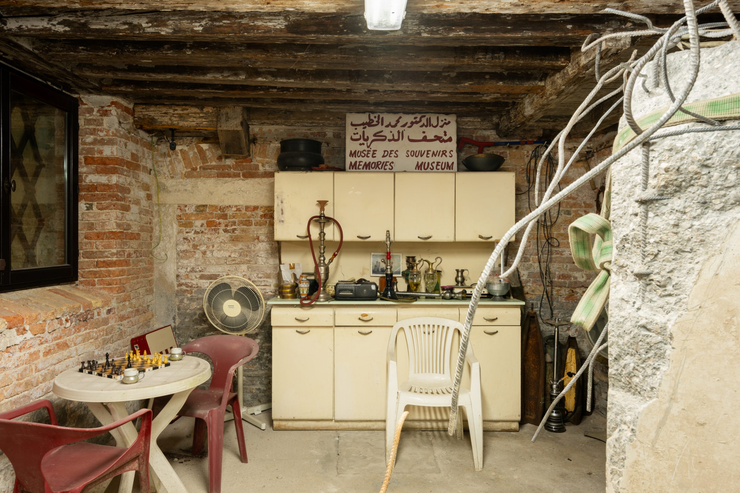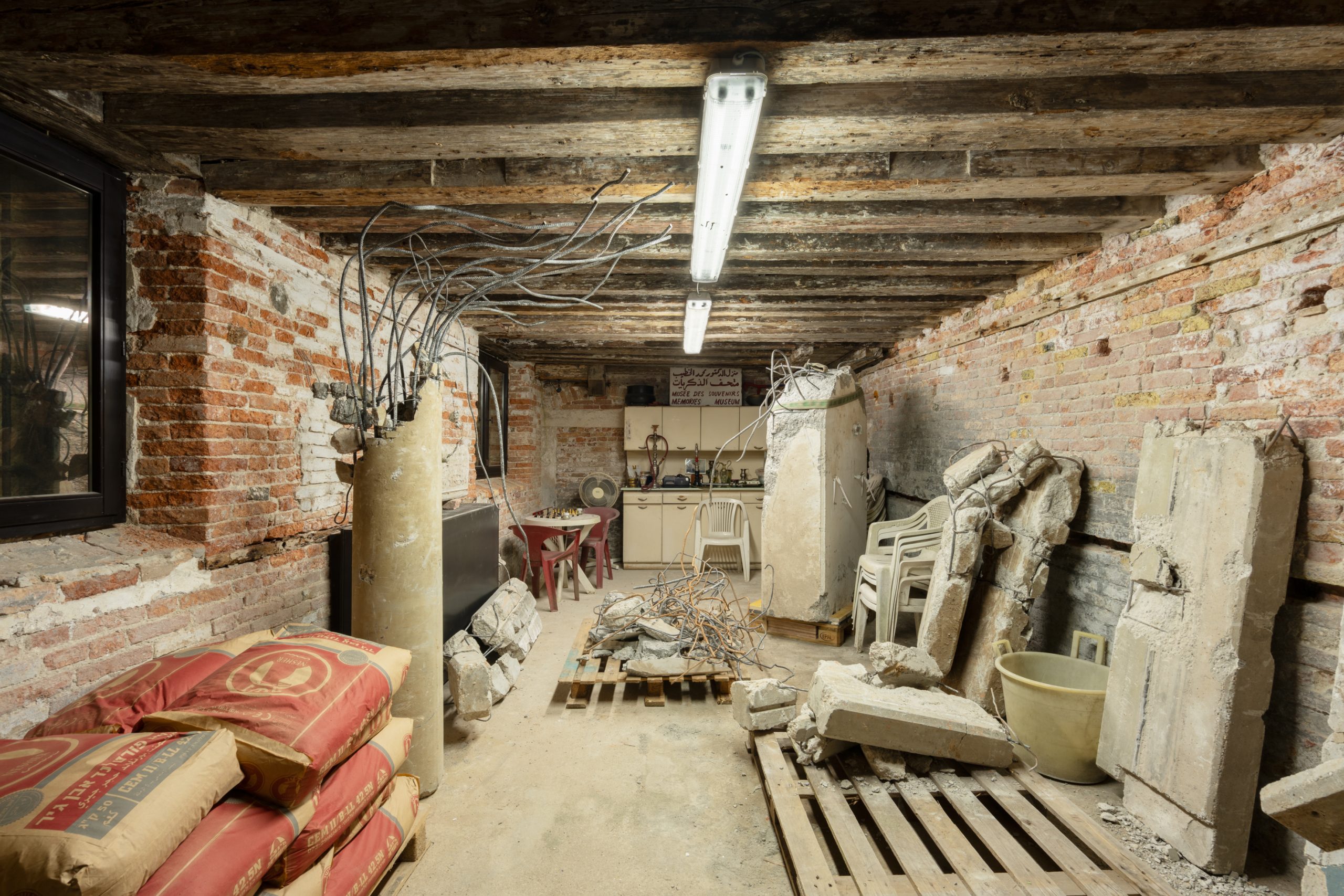 Uscendo si ripassa da dove si è venuti, ma ormai si vivono quegli spazi, quegli oggetti accatastati in maniera completamente diversa, sicuramente più consapevole. Prima la cattedra del tribunale, su cui cade la luce della serenissima, simile all’altare di una chiesa, poi le brande per gli sfollati. Pezzi di computer distrutti. Il Banco Alimentare svuotato e abbandonato (ricordi di lockdown). Una cassaforte sventrata. Raccoglitori per l’acqua. Un carrello della spesa. Tapparelle. Una cappella con calcinacci. Un confessionale. Ancora una volta le stampelle, le carrozzelle. Impossibile non pensare ai bambini palestinesi. Una cantina pienissima e puzzolente. Asfissiante, un articolo di giornale che parla di femminicidio. Büchel non si dimentica di nessuno. Ci circonda da tutto ciò che vorremmo evitare, nascondere. Eppure questa immersione nel rimosso ci libera lo sguardo, quando finalmente si torna in superficie, si esce dall’incubo, si continua a guardare il mondo con quegli stessi occhi, con la stessa attenzione e cura al minimo dettaglio, dettata da uno sconfinato desiderio di sopravvivenza, d’amore.