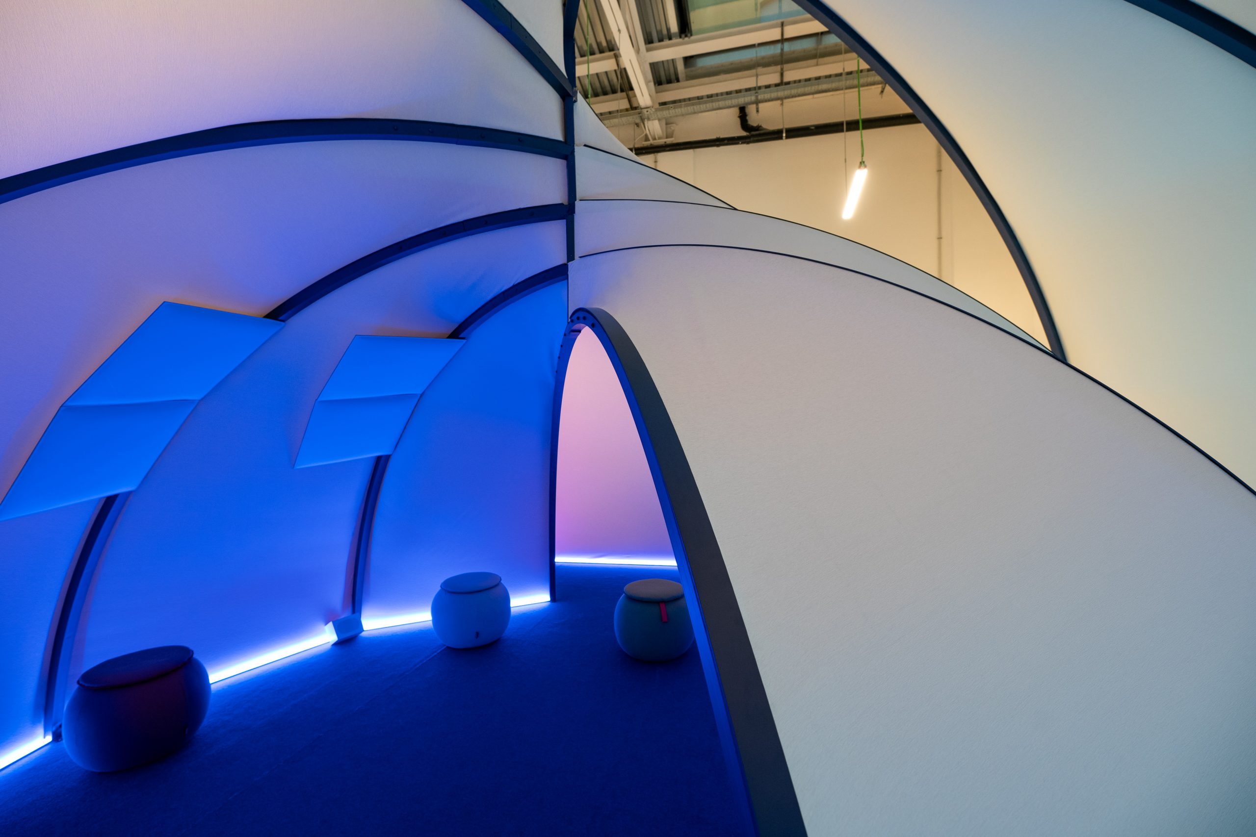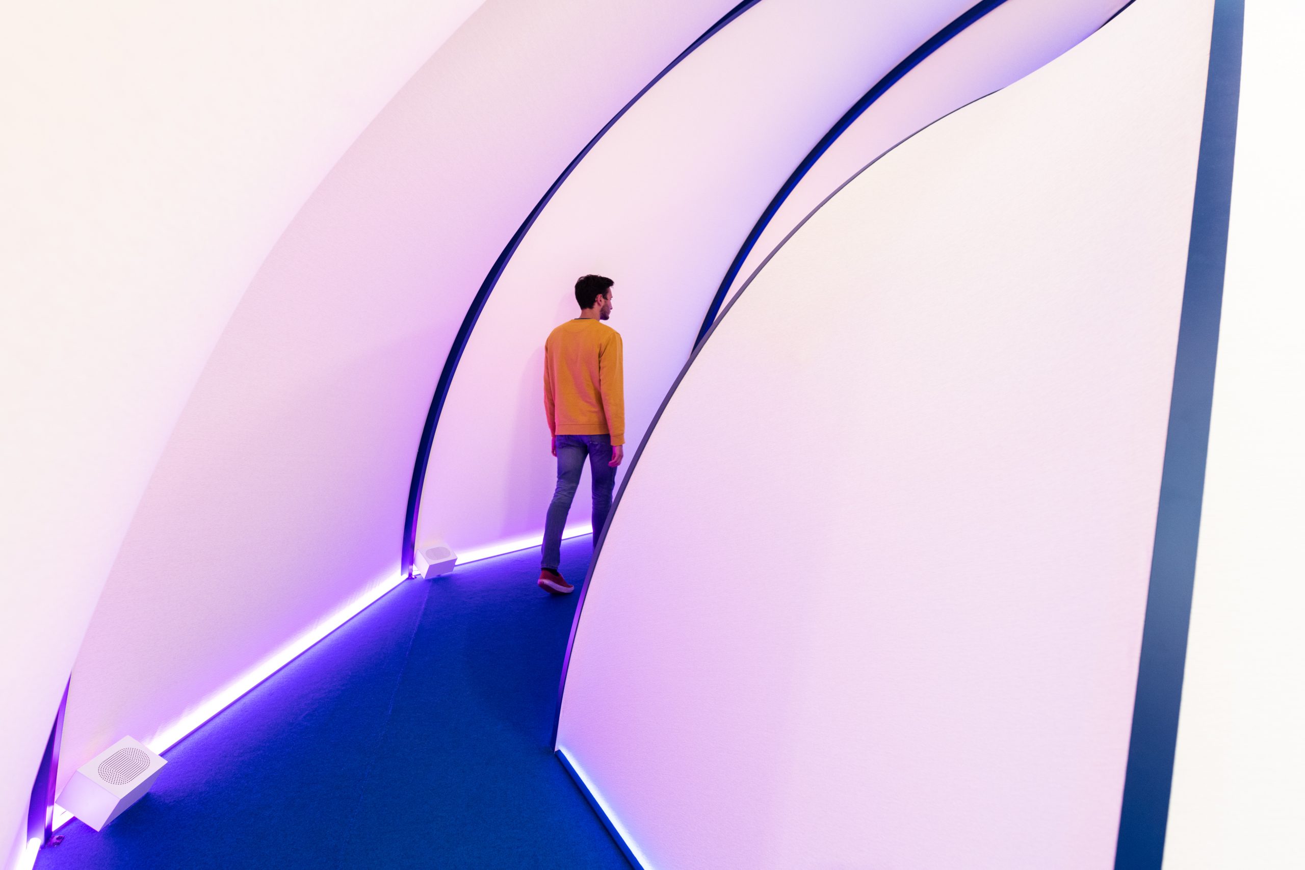Lo spazio acustico di Inhabit Sound vuole spingerci a riattivare questa sensibilità, per questo è ottimizzato per consentire un’immersione in tre panorami sonori distinti: il passato prossimo si basa sul mondo sonoro urbano che ci circonda quotidianamente, composto quindi da suoni che sentiamo abitualmente ma a cui magari non siamo portati a prestare attenzione; il tempo sospeso dilata i confini temporali per incoraggiare una riflessione sulla percezione del sé e del presente; il futuro ipotizza infine uno scenario uditivo sviluppato nel segno dell’equilibrio sonico urbano. Lo speciale tessuto acustico sostenibile e la soluzione “Raum-im-Raum” (stanza nella stanza) permettono di ridurre l’energia del campo acustico, riducendo fenomeni di disturbo e riverbero. Il trattamento materico dello spazio è poi stato ridotto all’essenziale, per favorire la concentrazione sul soundscape e sulla sua influenza sulle altre dimensioni sensoriali. Il cuore della struttura è invece uno spazio più isolato, grazie a pouf e pannelli rivestiti in tessuto fonoassorbente: ci si sente al sicuro e a proprio agio, come in una sorta di tana che rende possibile la totale percezione della propria presenza aumentando la consapevolezza di ciò che ci circonda. Nella parte finale di questo piccolo viaggio, poi, i suoni della natura rimangono più nitidi e in armonia con i suoni della città, reinterpretati in chiave avveniristica.