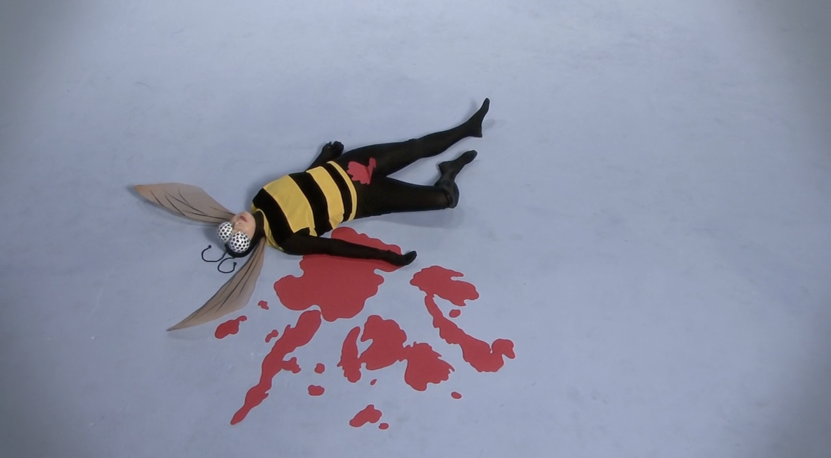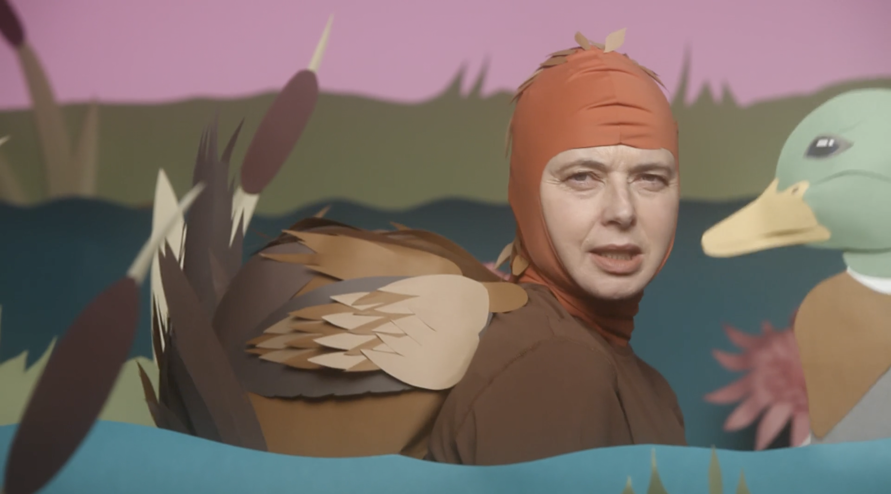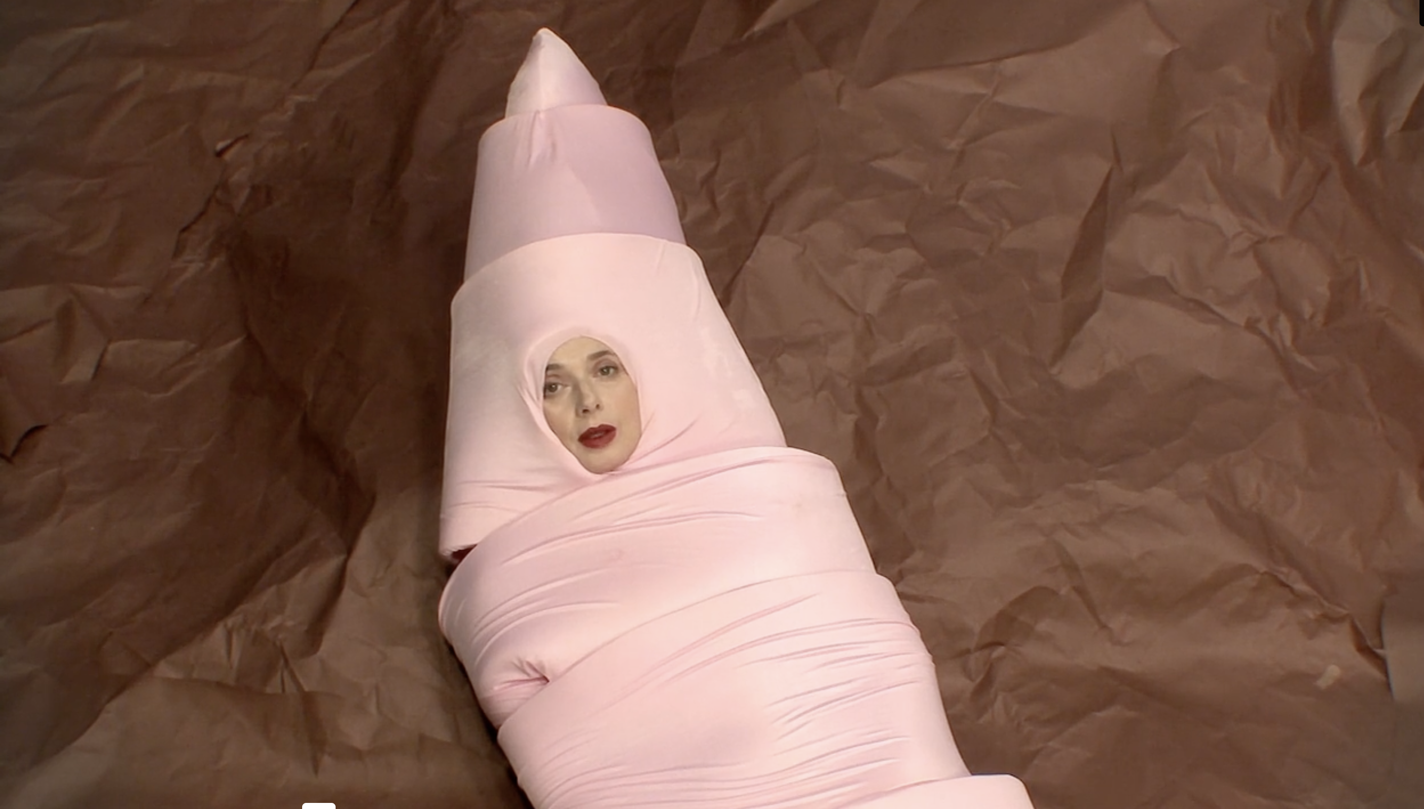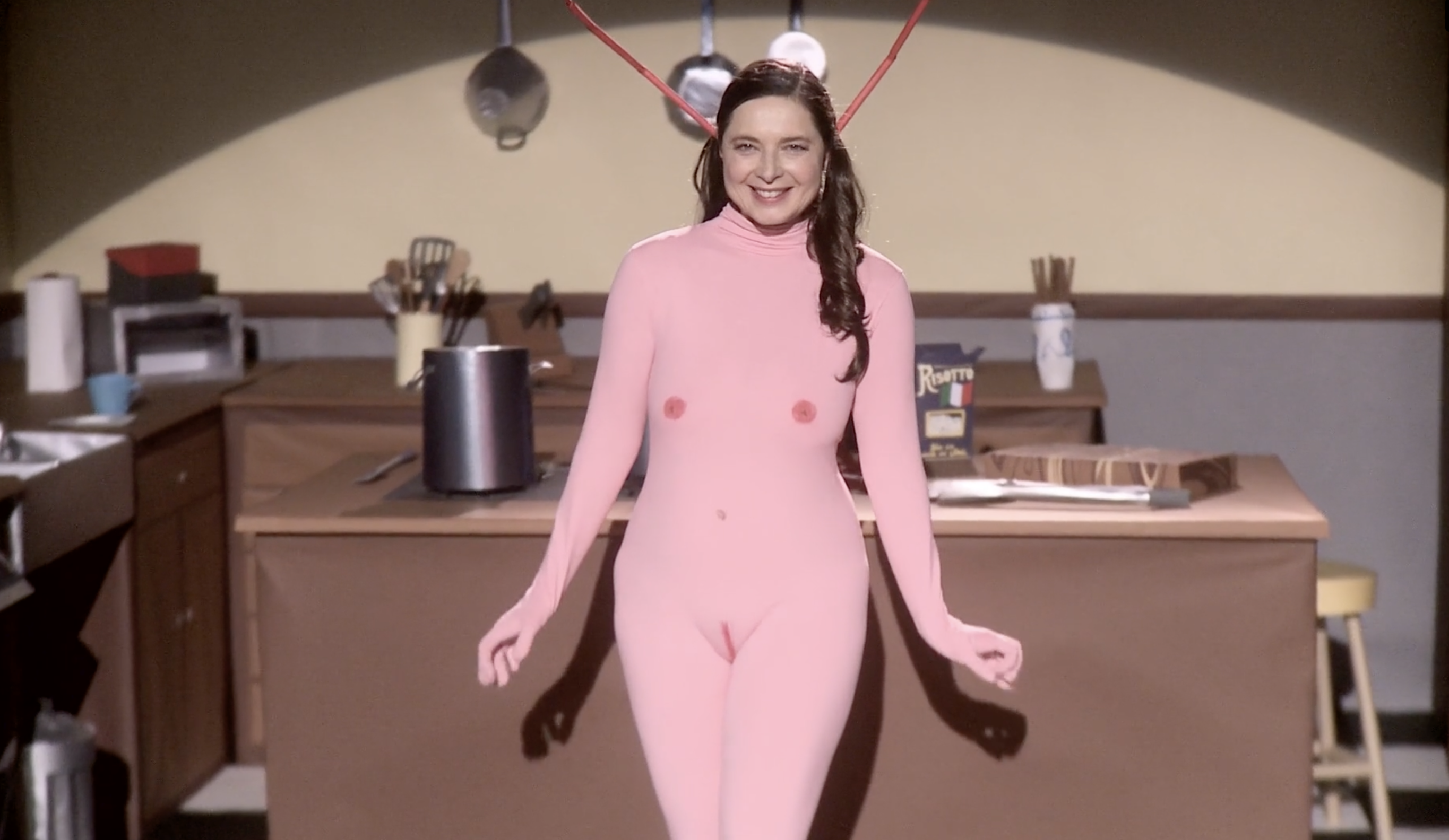 I corti di Rossellini sul mondo animale ricordano qualcosa a metà tra l’immaginario onirico di Michel Gondry, in particolare col sapore de L’arte del sogno, e le scenografie di un programma per bambini, a metà tra la bidimensionalità della carta e le strutture di gommapiuma o altri materiali morbidi ma duttili, malleabili e capaci di ottenere un ingombro. L’immaginazione infatti spesso assume forme tratteggiate, fulminee, rapide, che sacrificano il dettaglio ai sensi, alla possibilità della mente di attingervi grazie alla creazione di una scena fantastica, immaginaria. I costumi da animale che l’attrice indossa sono ingombranti. Sono l’opposto della nudità. Ricordano gli imbarazzanti costumi che sono costretti a indossare mascotte sottopagate nei parchi divertimento. Così il corpo dell’animale – l’alterità indossata – diventa una maschera assoluta, che non occupa più solo il volto come nella commedia dell’arte italiana, o nelle cerimonie animiste africane – ma tutta la figura. L’opposto della nudità, insomma, che qualcuno potrebbe pensare fondamentale per approcciare il sesso. Eppure, in questa goffaggine, la percezione cambia, cambia l’istinto, cambiano le voglie, cambino i fini, cambiamo noi e cambia il nostro modo di vedere le cose. Appariamo buffi perché ci prendiamo sul serio, meglio, ci immedesimiamo completamente nella forma che abbiamo assunto, più o meno per scelta, più spesso subendo la pressione del contesto su di noi – sostanzialmente sotto forma di trauma.