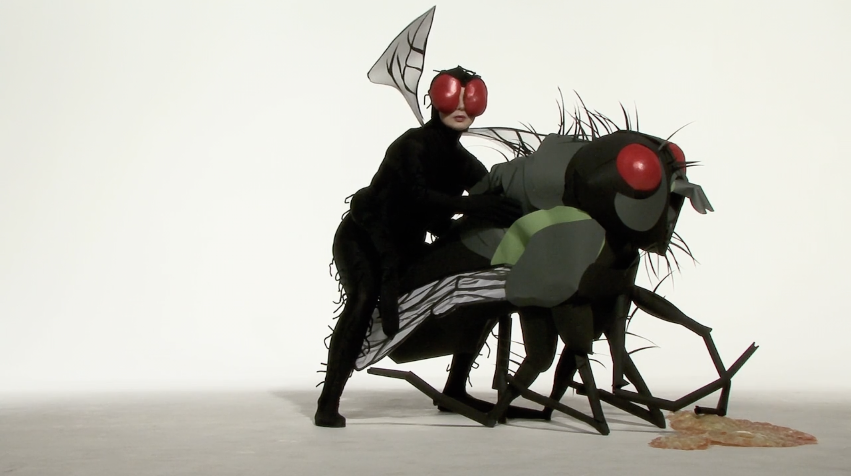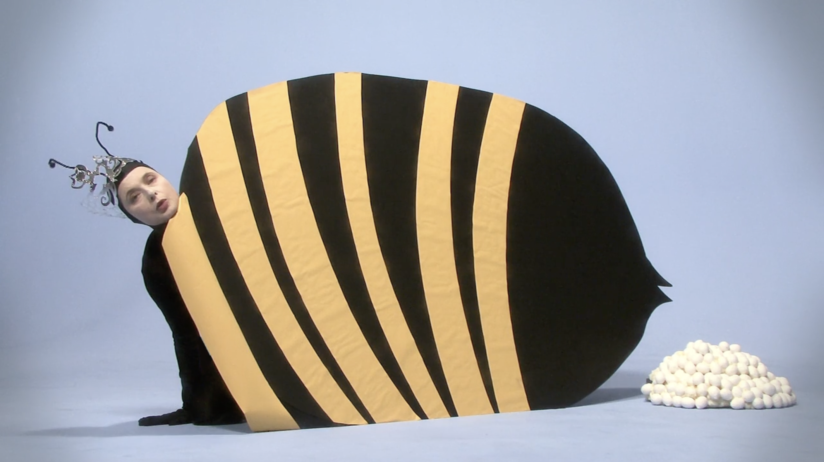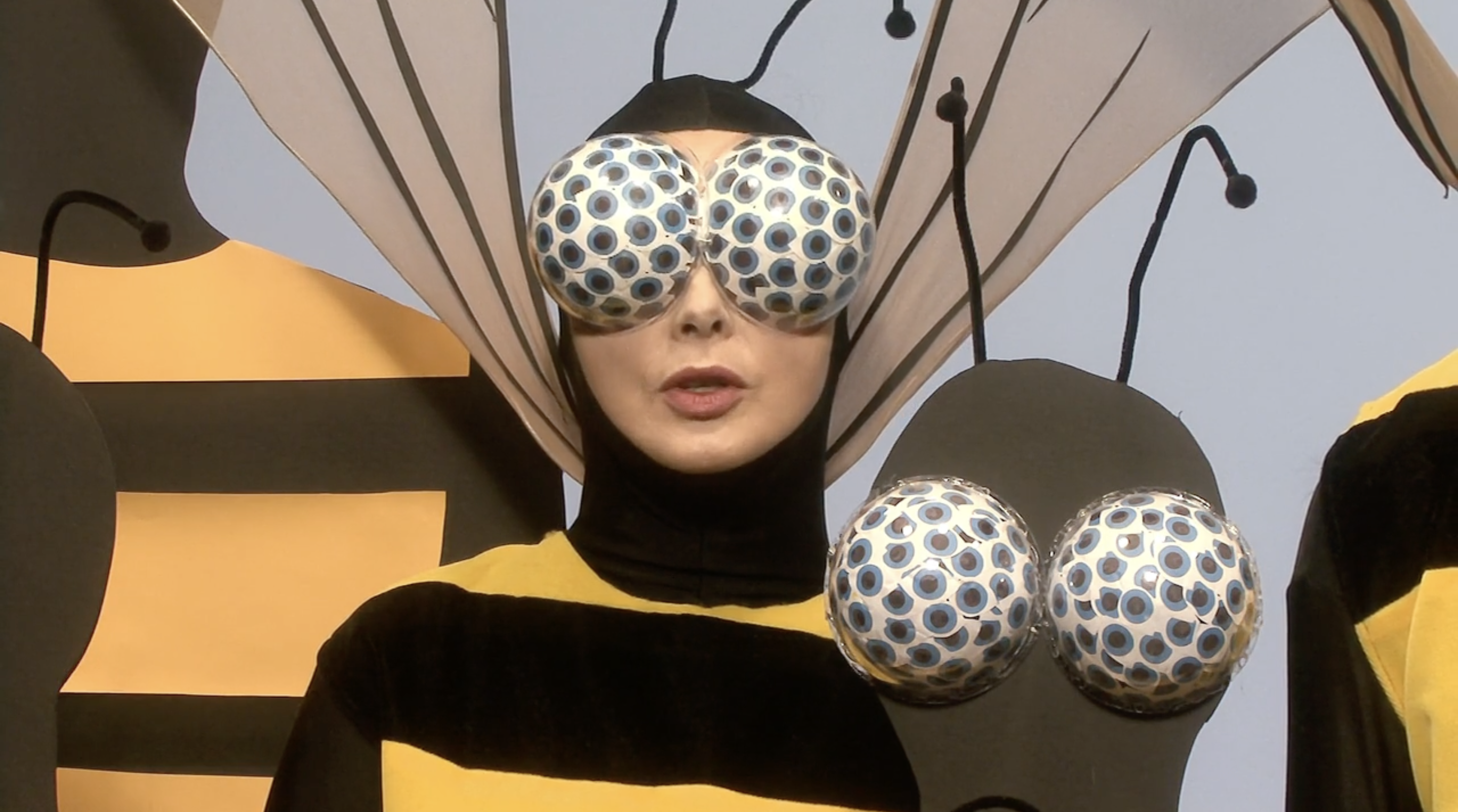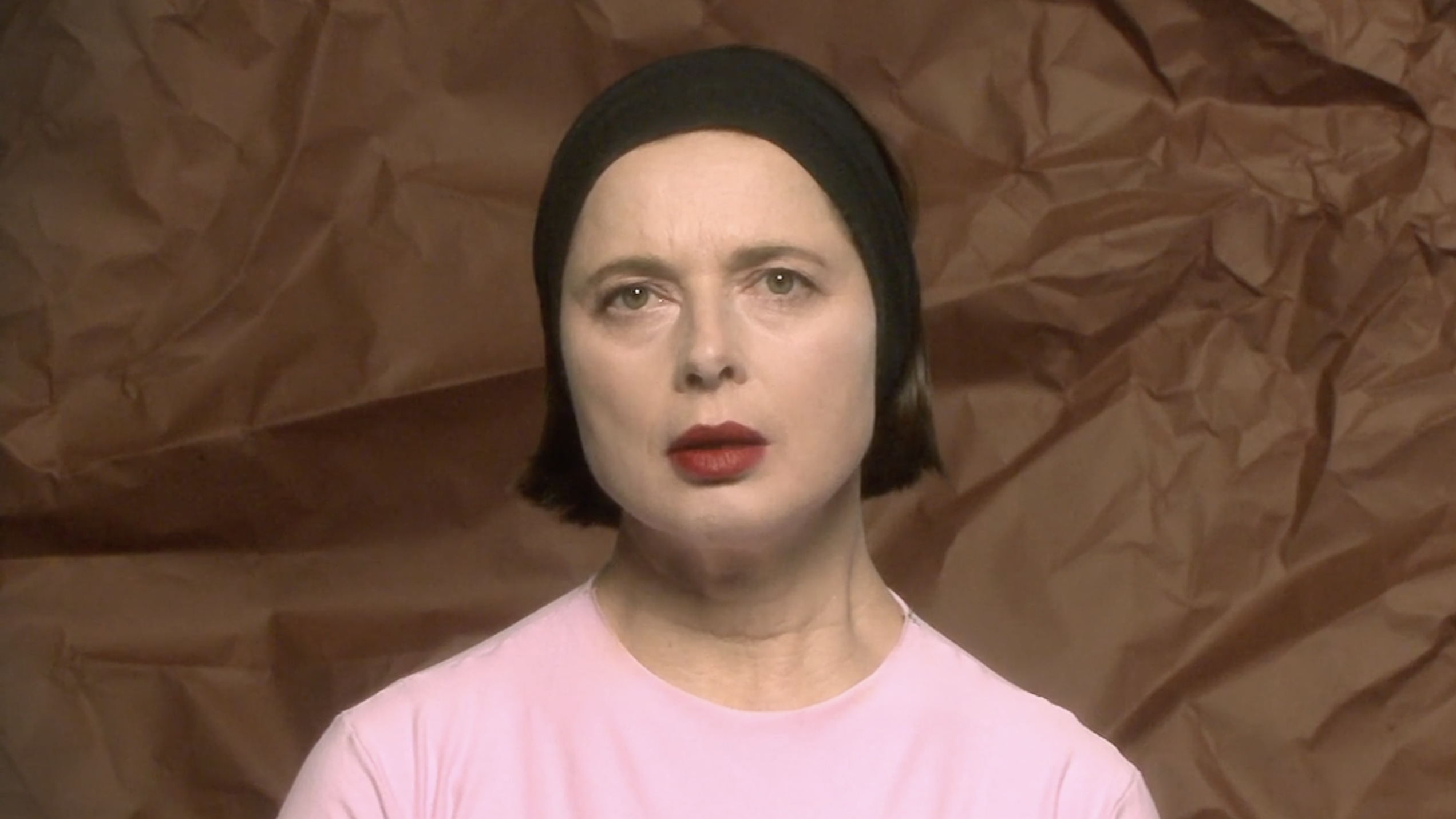I corti di Rossellini sul mondo animale ricordano qualcosa a metà tra l’immaginario onirico di Michel Gondry, in particolare col sapore de L’arte del sogno, e le scenografie di un programma per bambini, a metà tra la bidimensionalità della carta e le strutture di gommapiuma o altri materiali morbidi ma duttili, malleabili e capaci di ottenere un ingombro. L’immaginazione infatti spesso assume forme tratteggiate, fulminee, rapide, che sacrificano il dettaglio ai sensi, alla possibilità della mente di attingervi grazie alla creazione di una scena fantastica, immaginaria. I costumi da animale che l’attrice indossa sono ingombranti. Sono l’opposto della nudità. Ricordano gli imbarazzanti costumi che sono costretti a indossare mascotte sottopagate nei parchi divertimento. Così il corpo dell’animale – l’alterità indossata – diventa una maschera assoluta, che non occupa più solo il volto come nella commedia dell’arte italiana, o nelle cerimonie animiste africane – ma tutta la figura. L’opposto della nudità, insomma, che qualcuno potrebbe pensare fondamentale per approcciare il sesso. Eppure, in questa goffaggine, la percezione cambia, cambia l’istinto, cambiano le voglie, cambino i fini, cambiamo noi e cambia il nostro modo di vedere le cose. Appariamo buffi perché ci prendiamo sul serio, meglio, ci immedesimiamo completamente nella forma che abbiamo assunto, più o meno per scelta, più spesso subendo la pressione del contesto su di noi – sostanzialmente sotto forma di trauma.